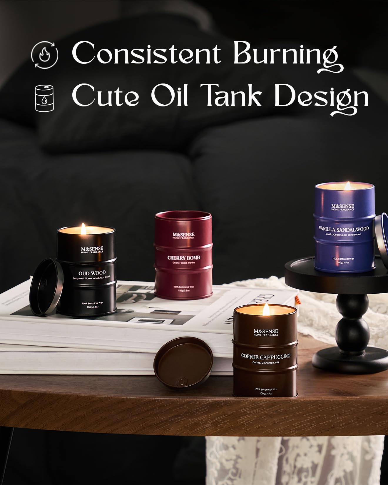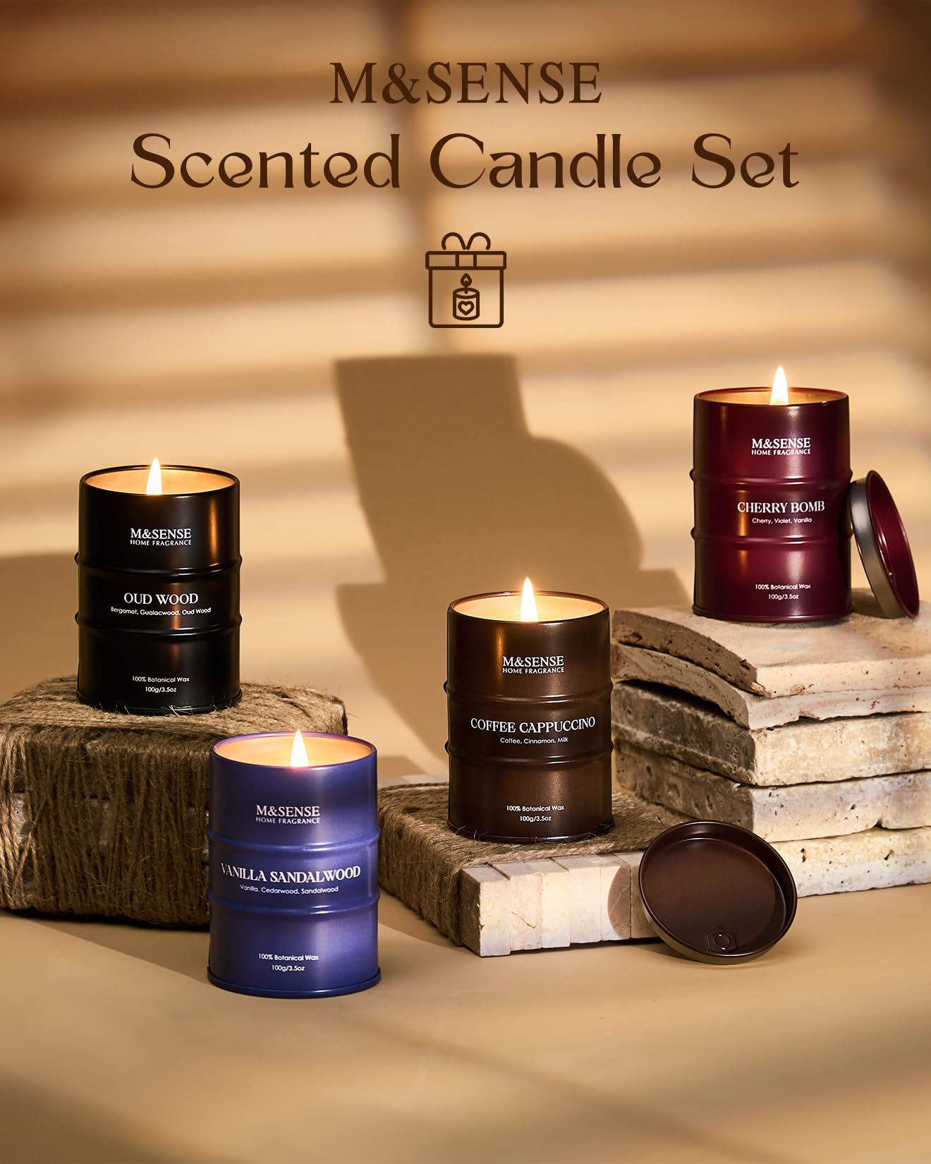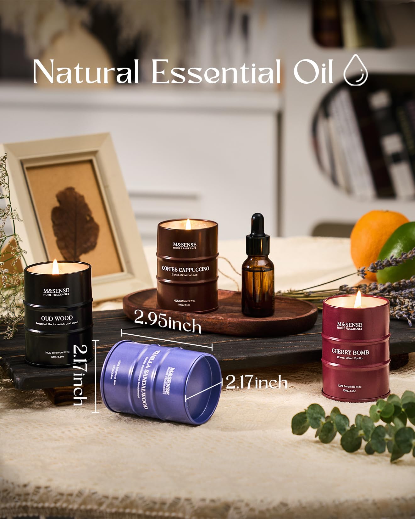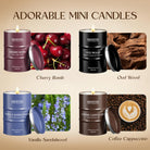 Cherry/Oud/Sandalwood/Coffee Pocket-sized and charming, these mini candles (2.15" x 2.15" x 2.95") bring a delicate glow anywhere—perfect for small holders, fairy gardens, dollhouse décor, or travel moments. Hand-poured with a natural soy and palm wax blend, they burn slower, last longer, and release fragrance more effectively than ordinary soy candles. Lead-free cotton flat braid wicks ensure a steady, clean flame with minimal soot. Packaged in an elegant gift box with multiple scents to explore, they make a thoughtful choice for birthdays, holidays, anniversaries, or simply treating yourself. Crafted with sustainable materials, reusable tins, and eco-friendly packaging, they’re as kind to the planet as they are delightful to enjoy.