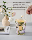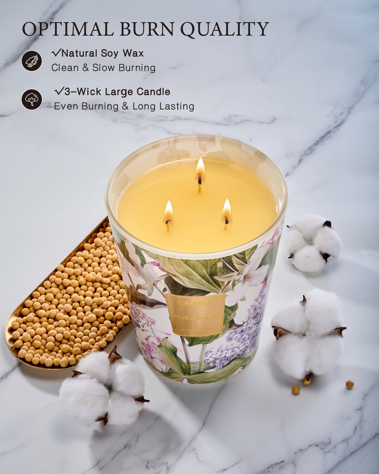 Experience M&SENSE craftsmanship with our 35oz (990g) three-wick candle, offering up to 150 hours of burn time. Made from a premium soy and palm wax blend, it burns slower and cleaner with a stronger fragrance throw for larger spaces. Three lead-free cotton wicks provide a steady flame and warm glow. The floral-pattern jar with an elegant gold label exudes luxury, making it perfect for décor or gifting. Beautifully boxed, it’s ideal for any occasion—Christmas, birthdays, anniversaries, or simply elevating your home.