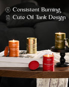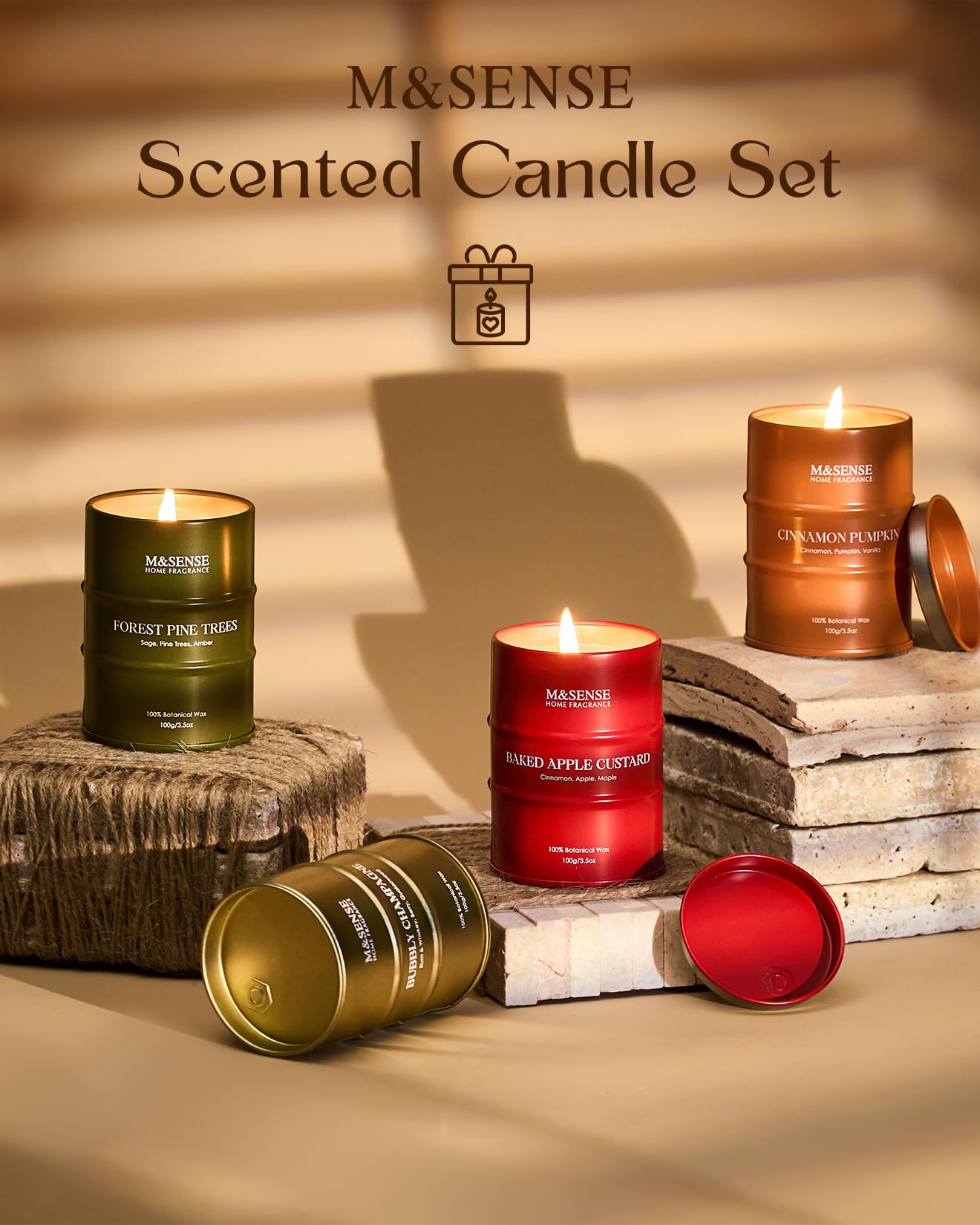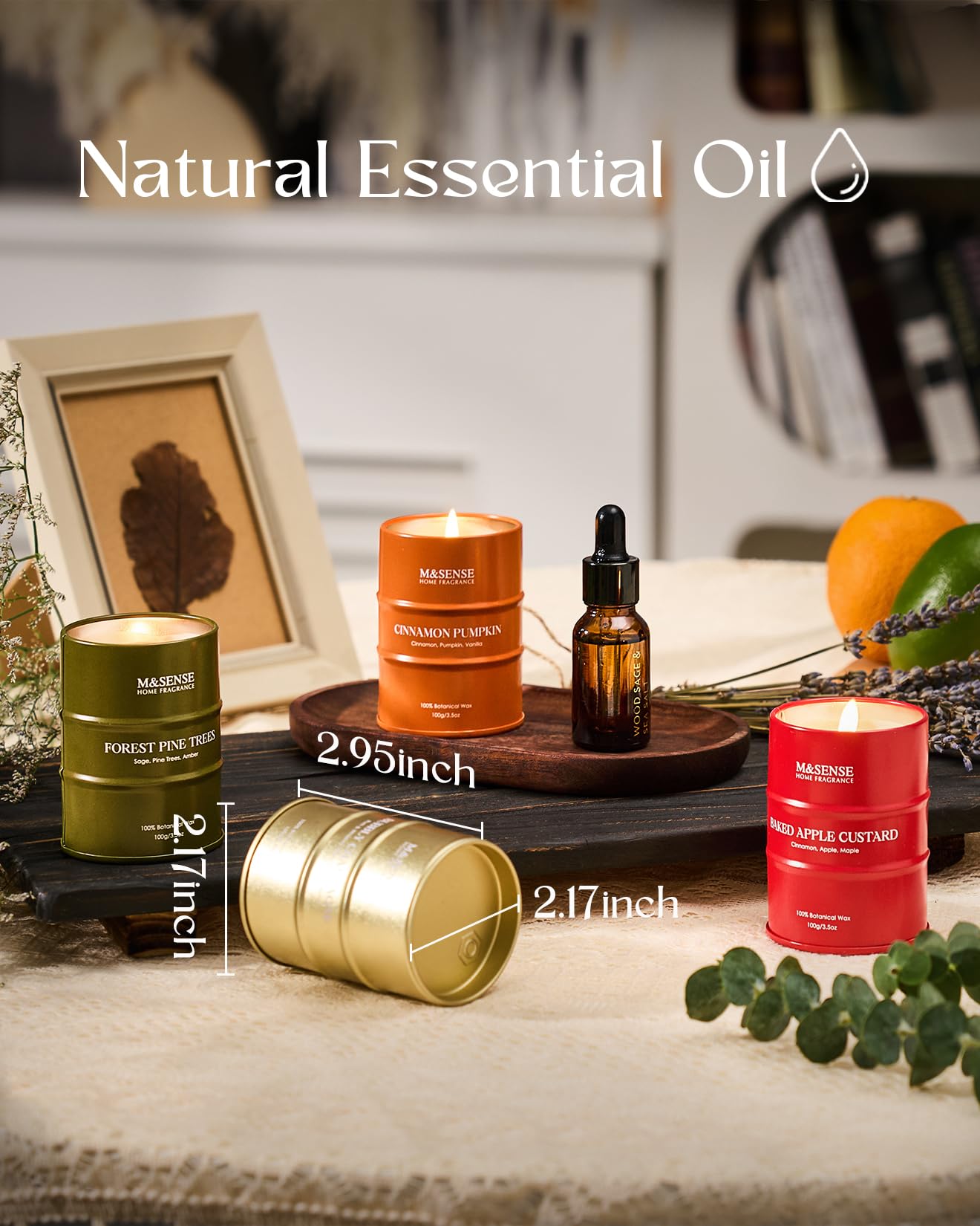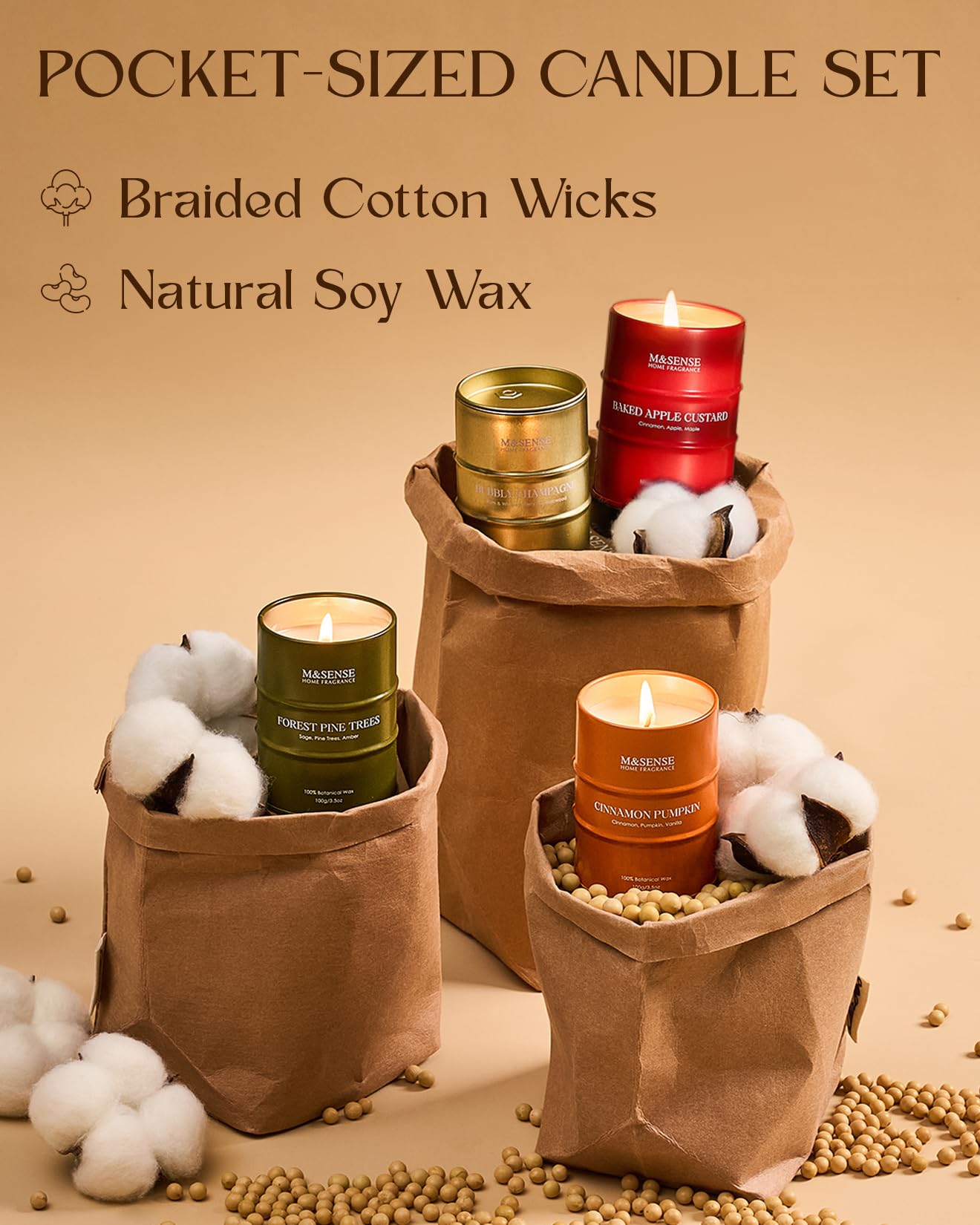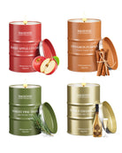 Apple/Pumpkin/Pine/Champagne Pocket-sized and charming, these mini candles (2.15" x 2.15" x 2.95") bring a delicate glow anywhere—perfect for small holders, fairy gardens, dollhouse décor, or travel moments. Hand-poured with a natural soy and palm wax blend, they burn slower, last longer, and release fragrance more effectively than ordinary soy candles. Lead-free cotton flat braid wicks ensure a steady, clean flame with minimal soot. Packaged in an elegant gift box with multiple scents to explore, they make a thoughtful choice for birthdays, holidays, anniversaries, or simply treating yourself. Crafted with sustainable materials, reusable tins, and eco-friendly packaging, they’re as kind to the planet as they are delightful to enjoy.
