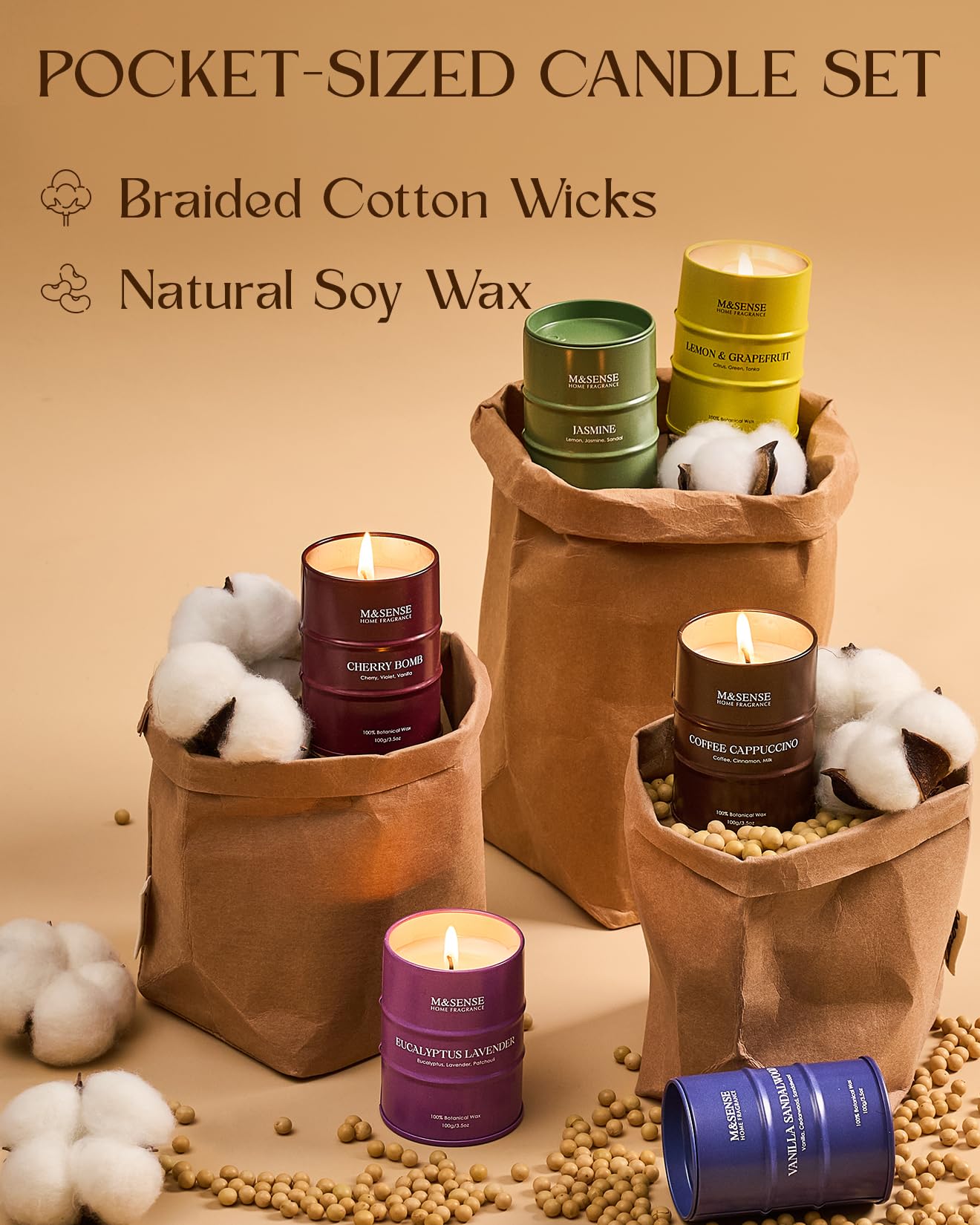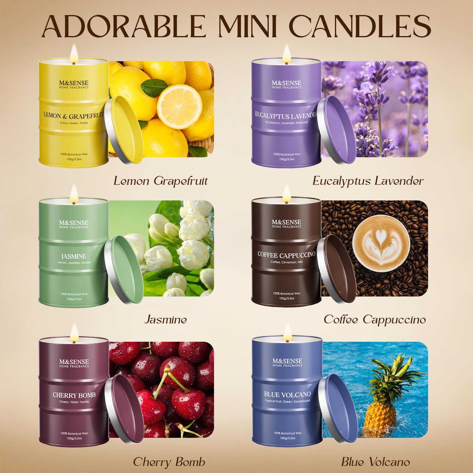 6 Pack Mini Classic Candles-Cherry/Lemon/Lavendar/Coffee/Jasmine/Blue Pocket-sized and charming, these mini candles (2.15" x 2.15" x 2.95") bring a delicate glow anywhere—perfect for small holders, fairy gardens, dollhouse décor, or travel moments. Hand-poured with a natural soy and palm wax blend, they burn slower, last longer, and release fragrance more effectively than ordinary soy candles. Lead-free cotton flat braid wicks ensure a steady, clean flame with minimal soot. Packaged in an elegant gift box with multiple scents to explore, they make a thoughtful choice for birthdays, holidays, anniversaries, or simply treating yourself. Crafted with sustainable materials, reusable tins, and eco-friendly packaging, they’re as kind to the planet as they are delightful to enjoy.