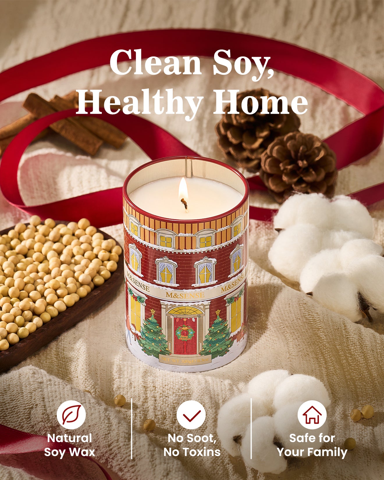 Celebrate the season with a candle that feels like Christmas. Wrapped in a festive design of a snow-dusted brick townhouse with joyful holiday figures, it captures the warmth and nostalgia of a classic winter scene. Infused with a cozy blend of coffee, wine, cinnamon, pine, and vanilla, it evokes the heartwarming aromas of the holidays. Hand-poured with a natural soy and palm wax blend, it burns longer, steadier, and throws fragrance beautifully. Lead-free cotton flat braid wicks ensure a clean flame with minimal soot. Presented in an elegant gift box, it’s a thoughtful choice for Christmas, birthdays, anniversaries, or any occasion. Made with sustainable materials and eco-friendly packaging, this candle is as kind to the planet as it is enchanting to light.