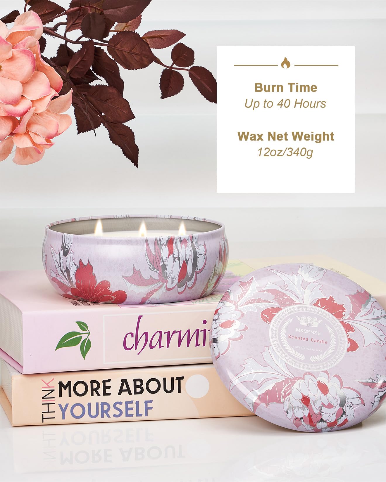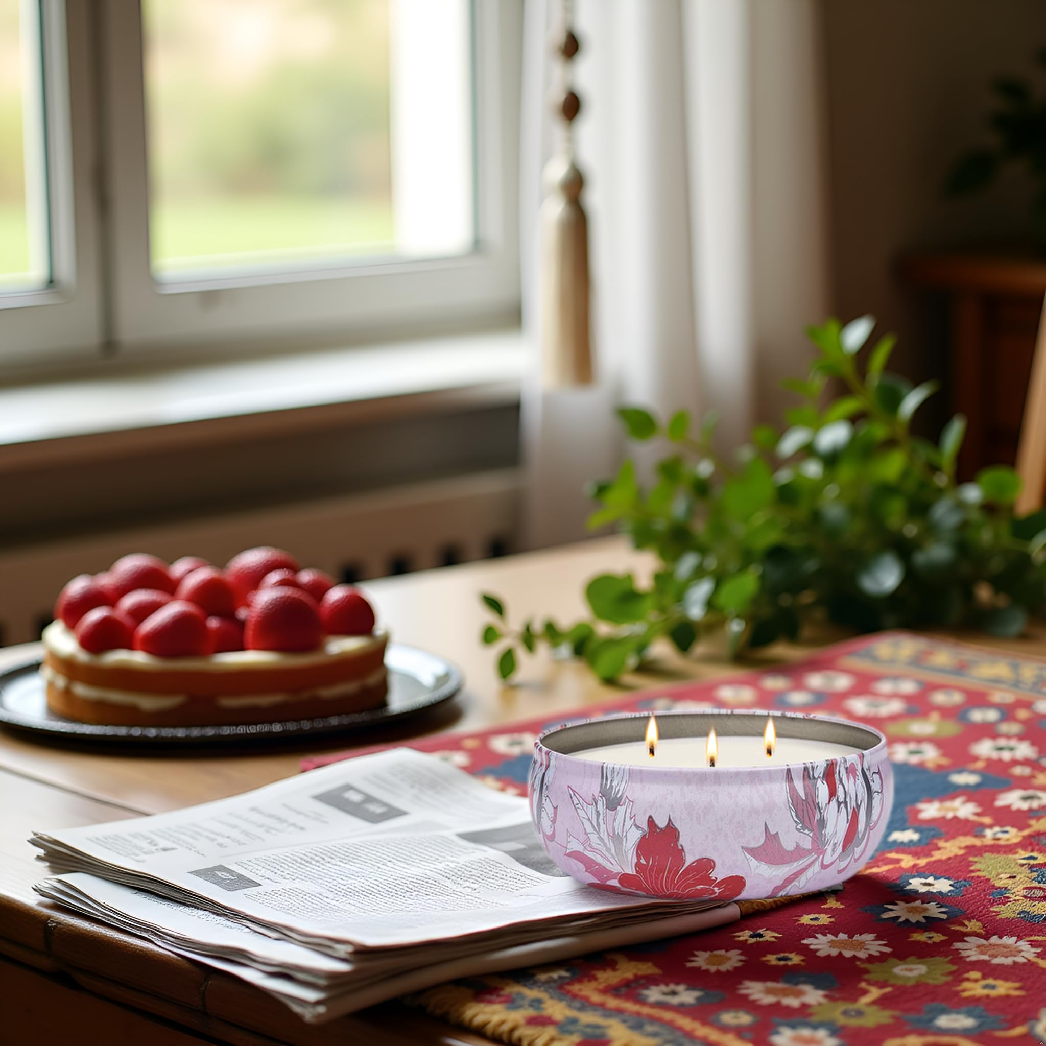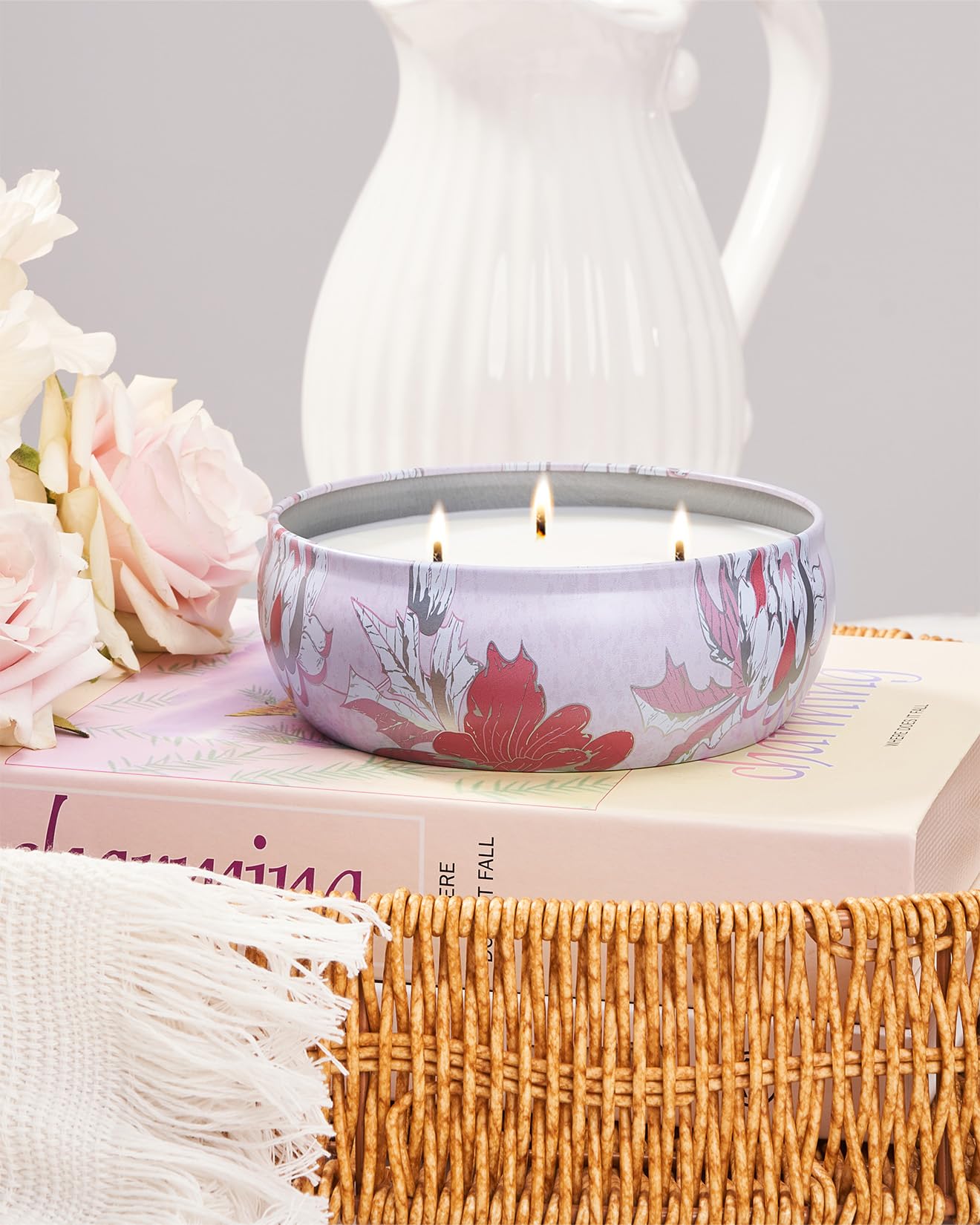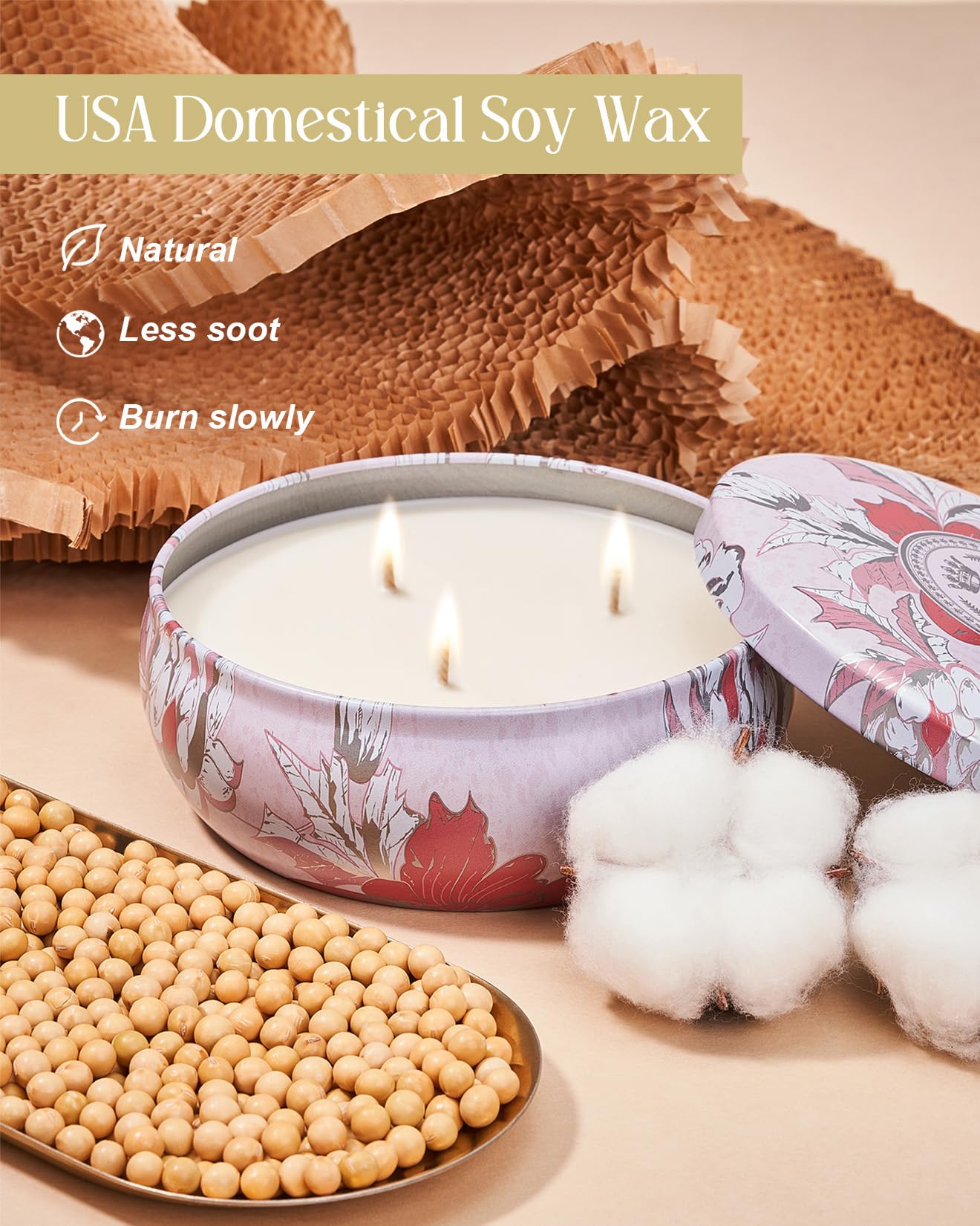 Elevate your home with our sustainable 3-wick scented candles. Hand-poured with American-grown soy and vegetable wax, each candle comes in a reusable tin and recycled packaging. Three self-trimming cotton wicks release stronger fragrance, filling larger spaces with an even, clean burn for up to 40–50 hours. Featuring exquisite floral tins with a modern vintage touch, they double as elegant décor and can be repurposed for jewelry or small keepsakes. Available in multiple scents, they bring warmth and soothing ambiance to every room.