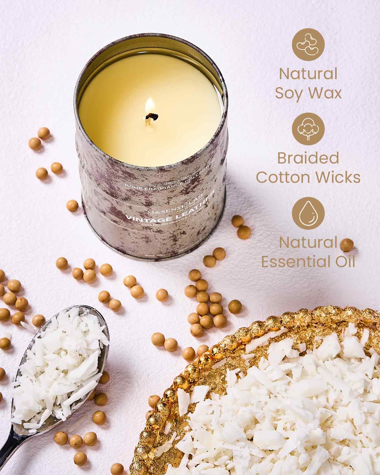 - Our candles are made with 100% soy wax formulated from premium soybeans and finest quality botanical essential oils—completely free of paraffin, synthetic fragrances, parabens, phthalates, and heavy metals. 100% Lead-free cotton wicks ensure a clean burn with minimal soot and no toxic emissions.