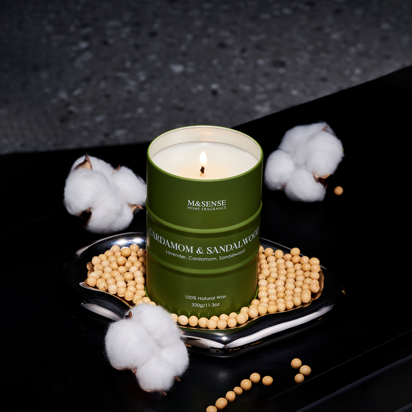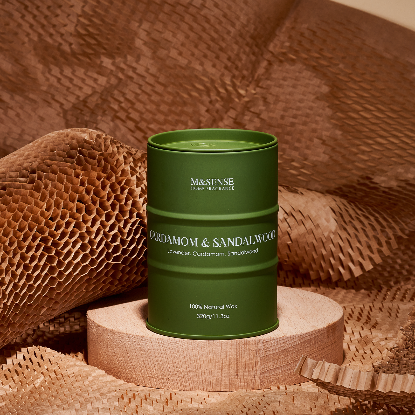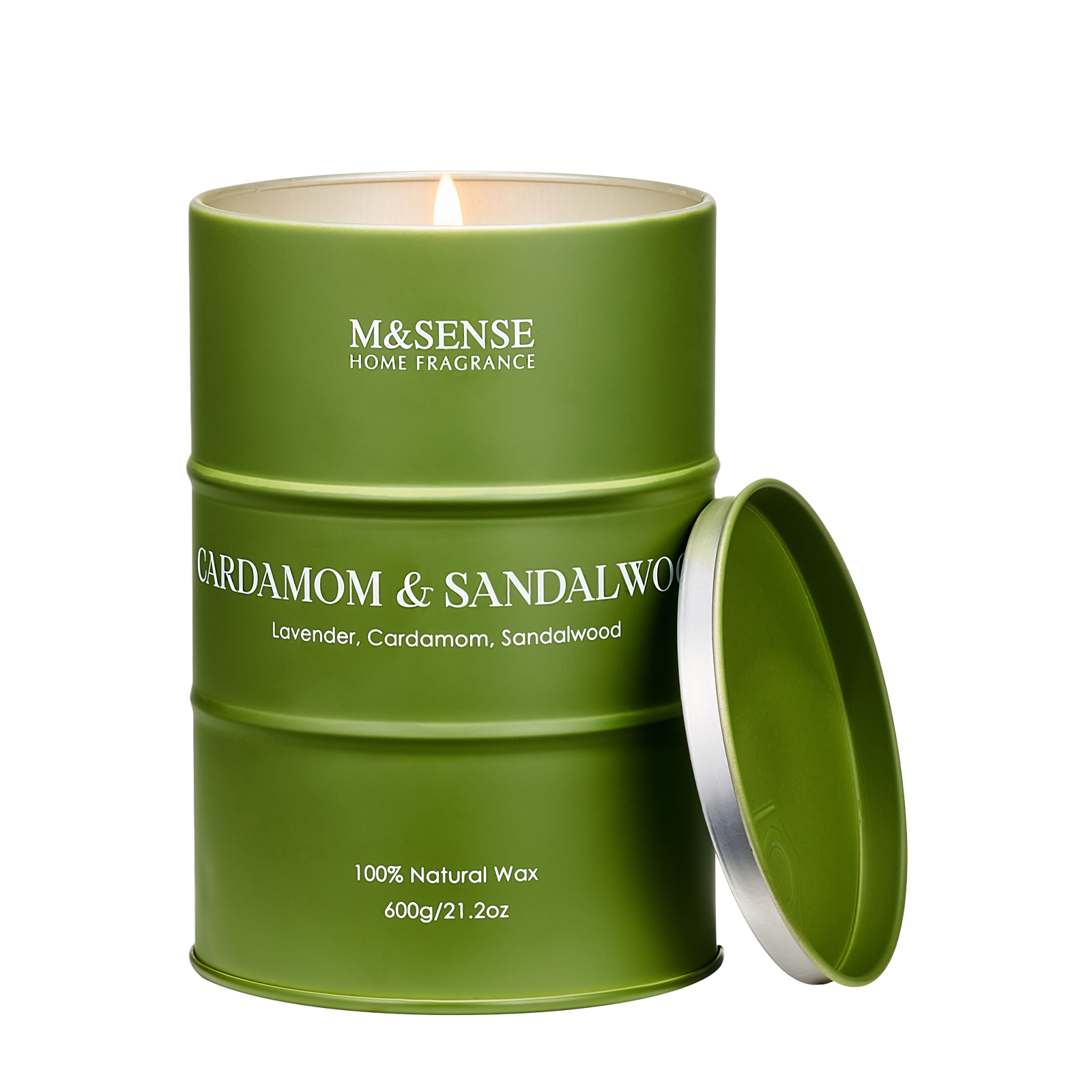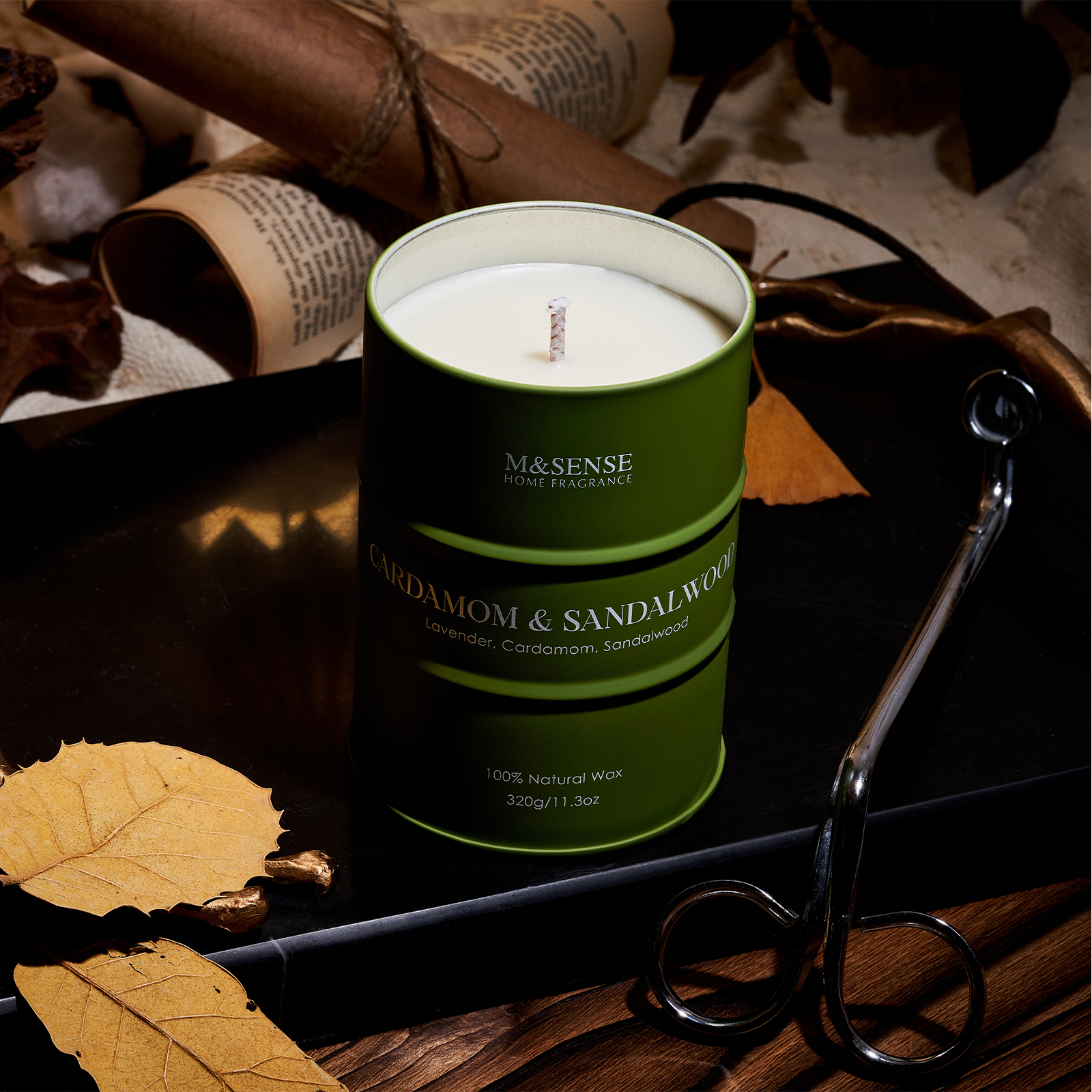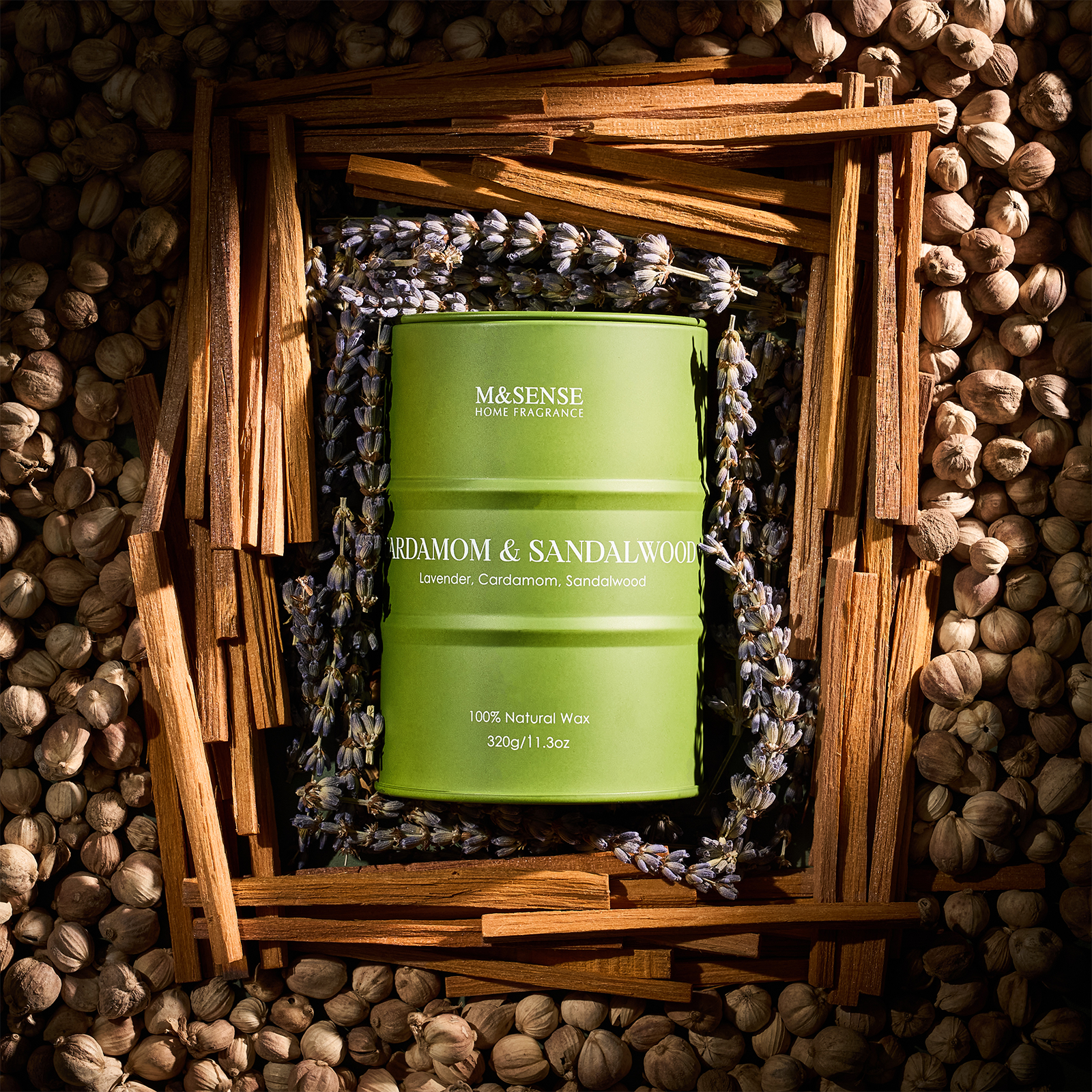 Soothing and refined, this M&Sense Scented Candle blends calming lavender with warm cardamom and grounding sandalwood. Poured into a rich forest-green barrel, it brings an earthy elegance to your space — serene, aromatic, and quietly confident.